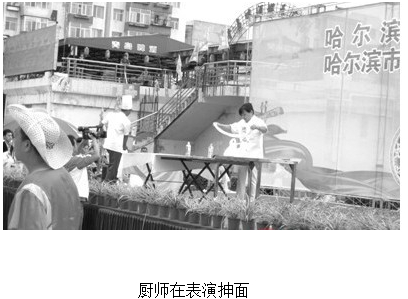 中國烹飪大師、國家級評委劉振華的雕刻巧奪天工;中國烹飪大師、滿漢全席擂臺賽金牌得主姜立濱用面捏的龍栩栩如生;中國烹飪大師、高級技師邢紅星的發絲豆腐讓人瞠目結舌。不出幾分鐘,一坨面團就在一位女廚師的手中變成了細如發絲的面條。主持人很容易就點燃了面條,現場爆發出熱烈的掌聲。