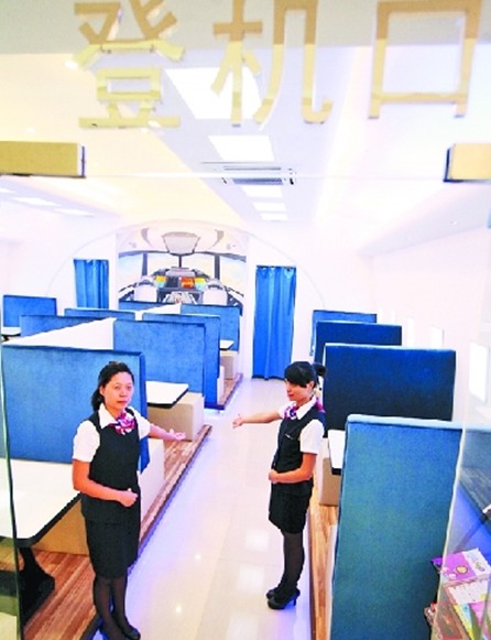 “歡迎登機(jī)!”一進(jìn)入餐廳,你就能看到服務(wù)員彎著腰,做出歡迎的手勢(shì)。“我們的服務(wù)員都是參考空姐的標(biāo)準(zhǔn)來招收,要求身高160cm以上,長(zhǎng)相清秀,笑容甜美等!秉S慧玲介紹說,服務(wù)員統(tǒng)一著空姐制服,上班前還得接受餐飲禮儀和空姐服務(wù)方面的培訓(xùn)。