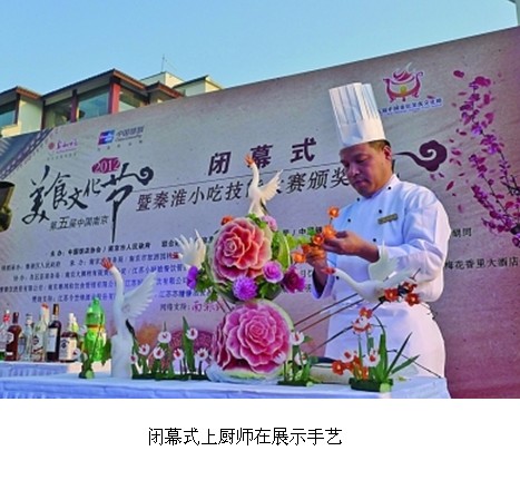 此次美食節(jié)閉幕式,不但集中展示了蟹黃湯包、蜜汁藕、麻團、回鹵干等“2012秦淮小吃大賽”的獲獎作品,還現(xiàn)場舉行了“第五屆中國南京美食文化節(jié)金陵名廚”大賽。10名來自江蘇酒家、真知味、小廚娘、漢府飯店等知名飯店的大廚,現(xiàn)場以“菊花魚”為題,PK廚藝。
