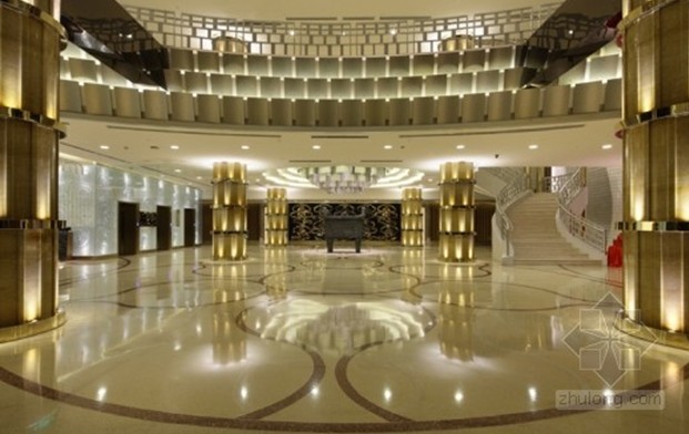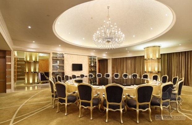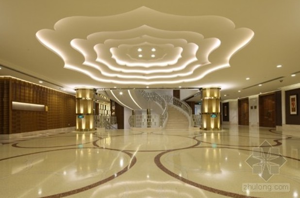 設計師摒棄了傳統高檔餐廳的金碧輝煌,在大廳的設計中將“牡丹”、“祥云”、“浮萍”、“瓦片”等元素運用其中,寄托了對東方文化的無限情感!澳档ぁ敝饕憩F在頂面造型之中,在恢弘的空間中增添了優雅的氣質,烘托清雅閑逸的情境!跋樵啤避S然于畫面之上,散發著無限曼妙的意境,富有煙云溟?的意趣,配合地面水波蕩漾的圖案,蜿蜓又悠然自得的神態表現的淋淋盡致,豐富了視覺效果,讓人不禁幻想是徜徉在一望無際的大海之中。中庭的設計將柱子與梁的結構大膽的運用和處理,使空間多了份莊嚴與質樸。傳統房屋中“瓦片”元素的運用更加貼近自然。