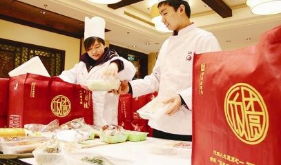 近日,蘇州某飯店服務(wù)員為“打包年夜飯”配菜。春節(jié)將至,蘇州一些“老字號(hào)”餐飲單位推出品種豐富的半成品“打包年夜飯”,讓市民在家中就能吃到美味可口的年夜飯。這樣既節(jié)儉又方便,受到消費(fèi)者青睞,銷(xiāo)售十分火爆。