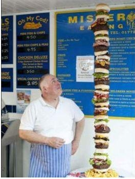 日前,英國蘭開夏郡一家名為“吃貨先生的飲食廣場”(the Mister Eater's Eating Emporium)的快餐店老板約翰?克拉克森(John Clarkson)和夫人花1個(gè)半小時(shí)聯(lián)手打造了這個(gè)約1.62米高,含30000 卡路里的巨型漢堡,并用特制金屬底座將其加固,確保巨型漢堡不會(huì)崩塌。