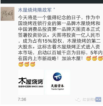 9月23日,對(duì)于“木屋燒烤”是一個(gè)里程碑式的日子,作為中國(guó)燒烤連鎖行業(yè)的第一品牌,與天圖資本正式簽署投資協(xié)議——天圖將投資1億人民幣,成為木屋燒烤第二大股東。