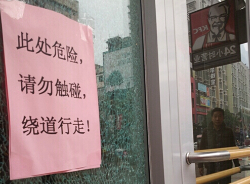 1月7日,記者在肯德基一樓門口看到,一塊鋼化玻璃被擊穿一個(gè)窟窿,整塊玻璃全部碎了,卻沒有掉下來。玻璃上貼了一張警示語:“此處危險(xiǎn),請勿觸碰,繞道行走”。據(jù)一名肯德基員工稱,這塊玻璃可能是由于顧客在玩耍時(shí),不小心碰爛的,事情發(fā)生有一個(gè)多星期了。已經(jīng)訂了新的玻璃,但是還未到貨。