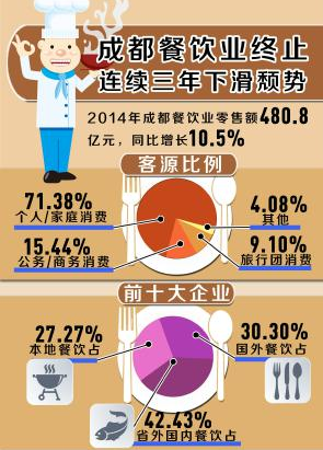 報告顯示,2014年成都餐飲業零售額480.8億元;同比增長10.5%,較2013年6.3%的增速提升了 4.2 個百分點;高于全國(9.7%)0.8個百分點;高于四川。10.1%)0.4個百分點。