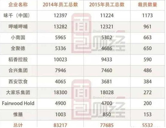 面包財經翻查了港股與A股餐飲類上市公司財報發(fā)現,大部分餐飲公司在2015年均采取了較為明顯的裁員措施。下圖為面包財經整理的在A股和港股上市餐飲企業(yè)員工數變化圖:上述10家餐飲企業(yè)裁員人數為5532人,裁員率為6%;其中味千員工數量減少最多,較上年減少1173名;全聚德員工減少比例則高達12%。