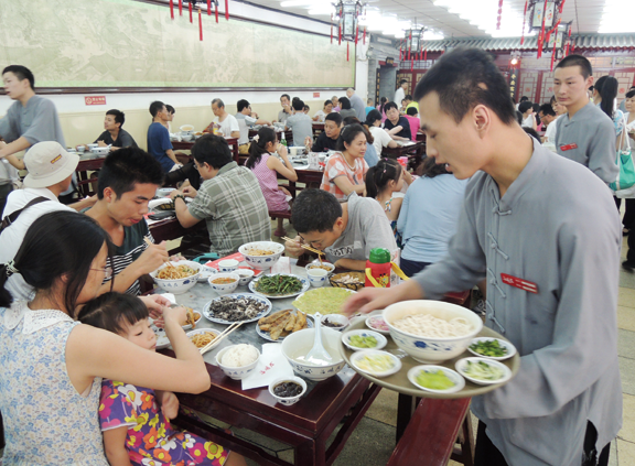 “來了,您哪,幾位,里邊請”、“小二,倒茶”這樣的高喊聲從人們一進門就伴隨在耳邊,讓人一下子沉浸在老北京的市井文化中,隨之而來的便是穿對襟衣衫,蹬圓口黑布鞋、戴瓜皮帽、肩搭手巾把兒的小伙計,帶著顧客來到大理石的八仙桌前,落座在紅漆實木的長條凳上。觀賞著一幅長約16米的畫作《清明上河圖》,聆聽著京韻大鼓,不知道還以為自己在排古裝戲!吃好喝好后,又會在門童和小二“送客、走好、您哪”的喊聲中愉快地離開。不過,與韻味十足的老北京氛圍不同的、能讓人回到現實的,是前臺的電腦軟件結賬系統和寬敞明亮的就餐大廳,向人們傳遞著現代科技與生活流行色交織在一起的飲食時尚。