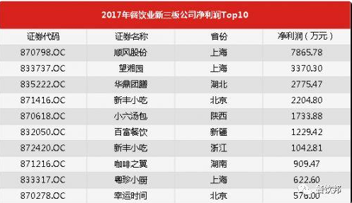 餐飲新三板也有好企業:2017新三板餐飲企業凈利潤Top10