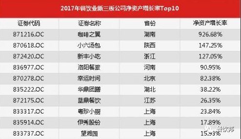 2017年餐飲業新三板公司凈資產增長率Top10榜單如下: