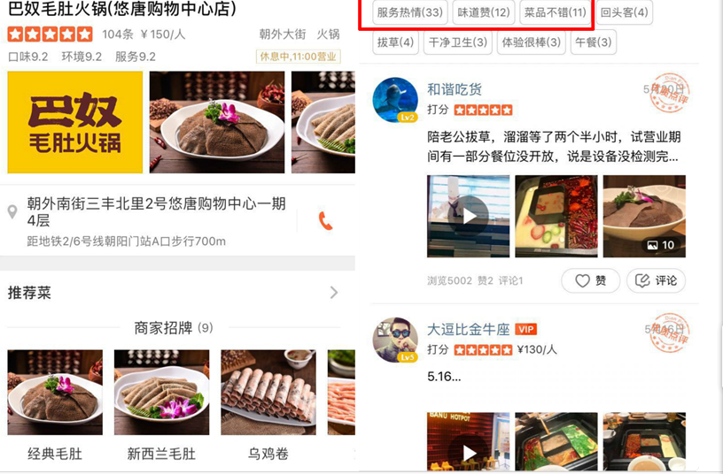 一周后,記者再次來到北京店就餐,店內(nèi)餐位已經(jīng)全部開放,仍然供不應求。據(jù)巴奴門店負責人透露,巴奴北京店定位為毛肚專家旗艦店。試營業(yè)當天賣了100多桌,此后幾天的數(shù)據(jù)都有增加。而從顧客的綜合評價來考核,截至發(fā)稿,巴奴北京店在大眾點評上已得到五星好評。97條評價中,好評89條,中評6條,差評2條。好評所夸贊的地方主要在服務、菜品、店面風格、鍋底等方面,其中超過30位顧客點了“服務好”這個標簽,而中評和差評指出的問題在價格偏貴(記者實測,人均消費150左右)、餐位預定等方面。