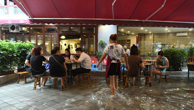老板: 當(dāng)時(shí)是因?yàn)槲覀冊谶@沖地,每天晚上都要進(jìn)行沖地,因?yàn)樘珶崃艘獪p少地氣,所以我們搞了一個(gè)這種火鍋,覺得把腳打濕了挺涼快的。